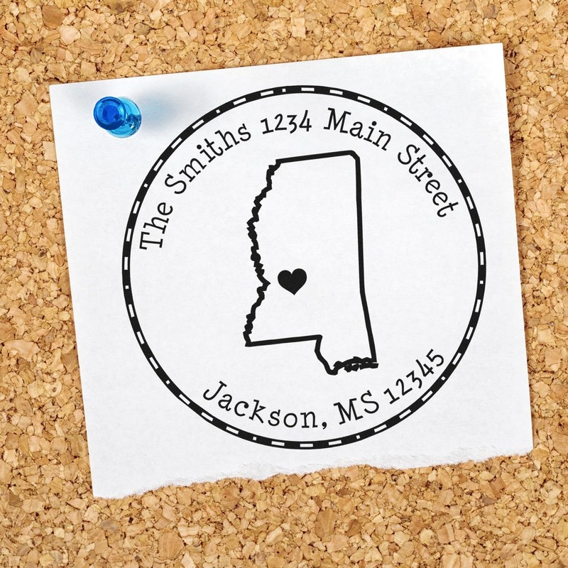 • ADDRESS STAMP FOR HOME USE MISSISSIPPI PRIDE DESIGN: Showcases a beautifully detailed state outline with heart over Jackson. Modern typography and decorative border make your correspondence stand out. Ideal size at 1-5/8" round for letterheads and envelopes.