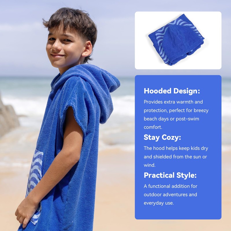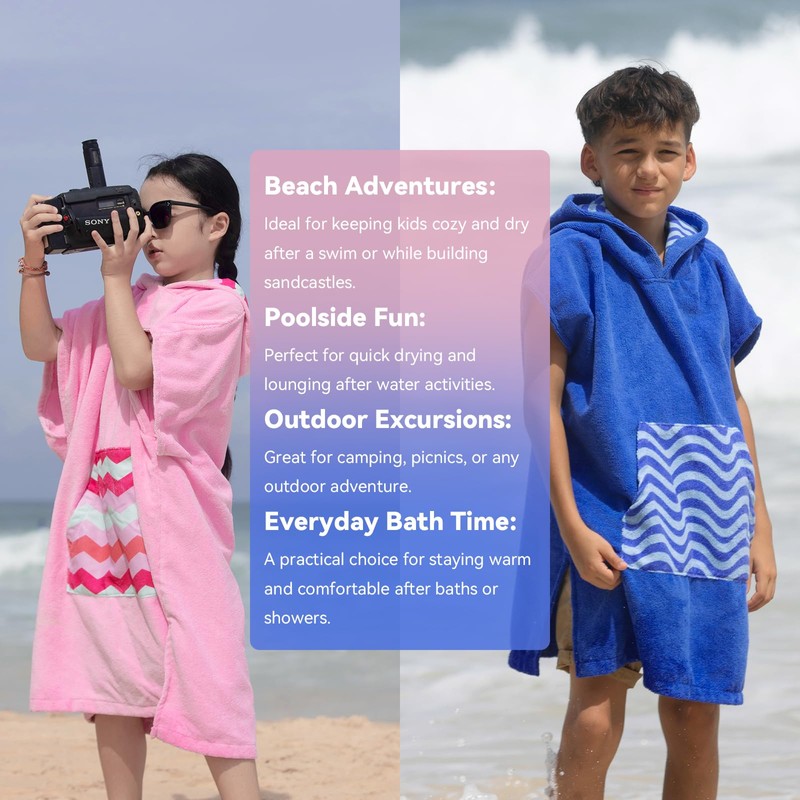 - [SOFT AND COMFORTABLE] This beach towelling robe for kids is made from soft Microfiber. The material is very soft and suitable for the sensitive skin of young children. This girls and boys hooded poncho towel for kids is absorbent and will dry your child easily. This hooded towelling robe is a must have summer accessory