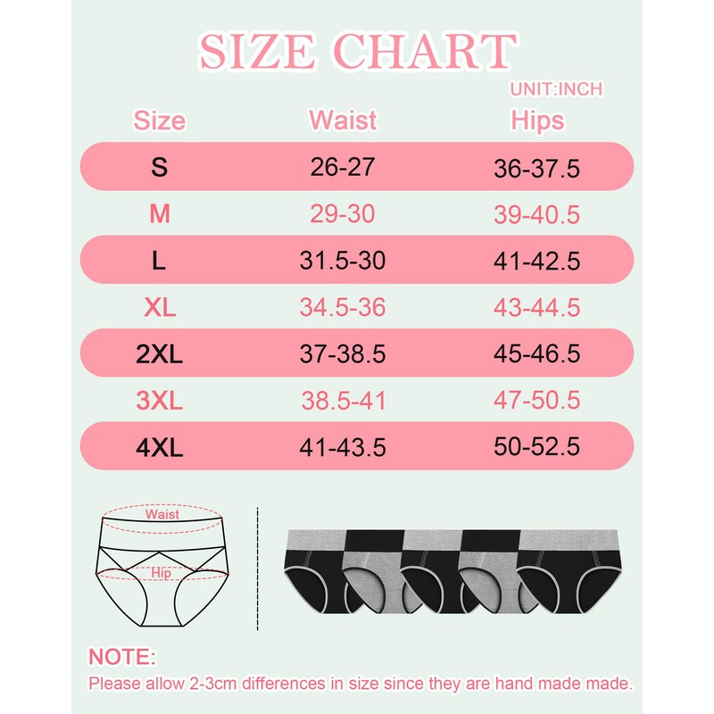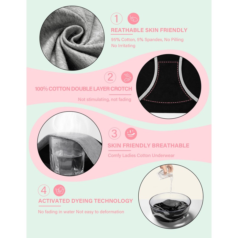 - Soft Breathable Cotton Material: This underwear are made of 95% high quality combed cotton and 5% spandex. The crotch of this women’s panties is extended double layer 100% cotton, The cotton has fine permeability which make you comfortable to wear day and night