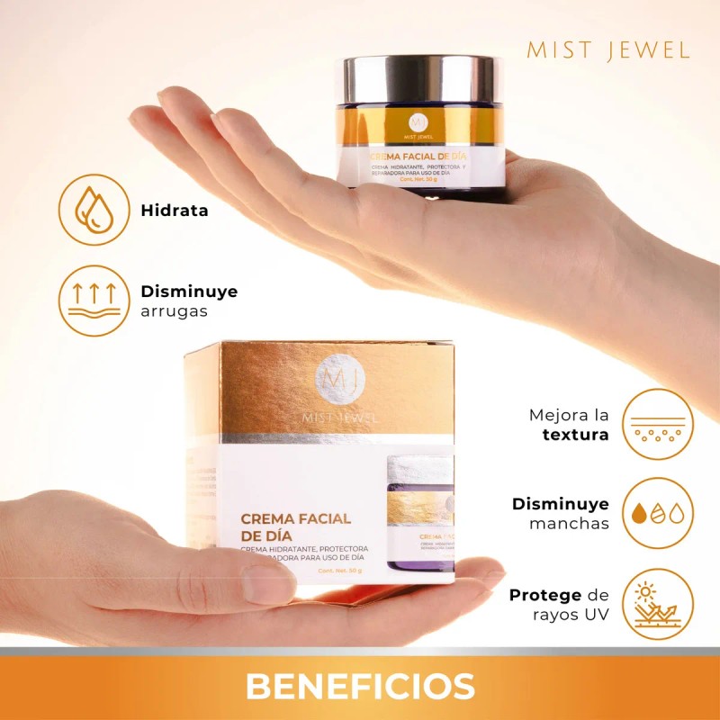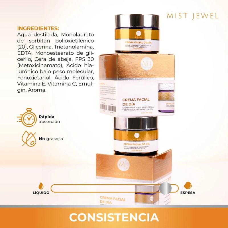 Mist Jewel Crema De Da Facial Con Fps 30, cido Hialurnico, Ferlico Y Vitamina C Para Todo Tipo De Piel 50g