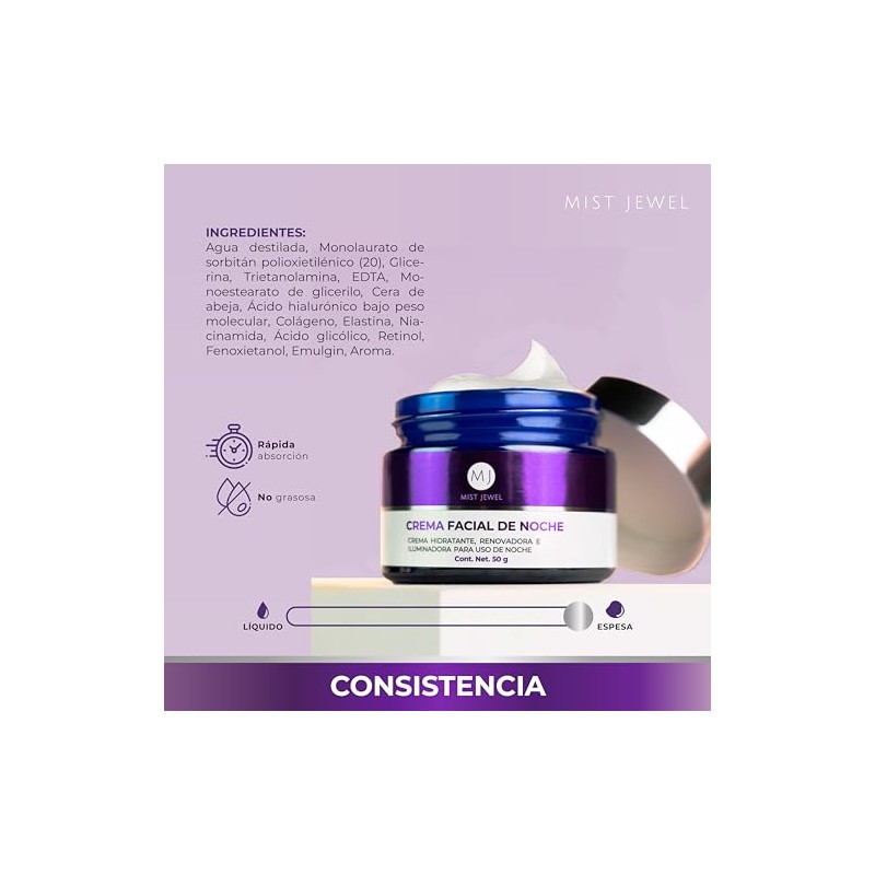 MIST JEWEL Crema de Noche Facial con Niacinamida, cido glicolico, Retinol, Elastina y Colgeno Crema reparadora e hidratante de cuidado facial para...