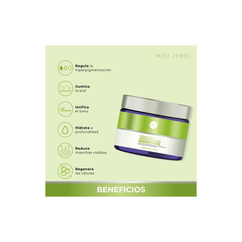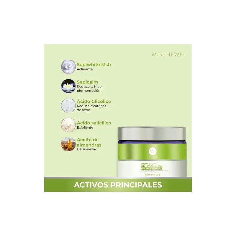 MIST JEWEL | Crema reductora de pigmentacion aclaradora para manchas faciales en la piel, antimanchas adicionado con ácido Glicólico y Salicílico para unificar el tono y reducir hiperpigmentación 50g