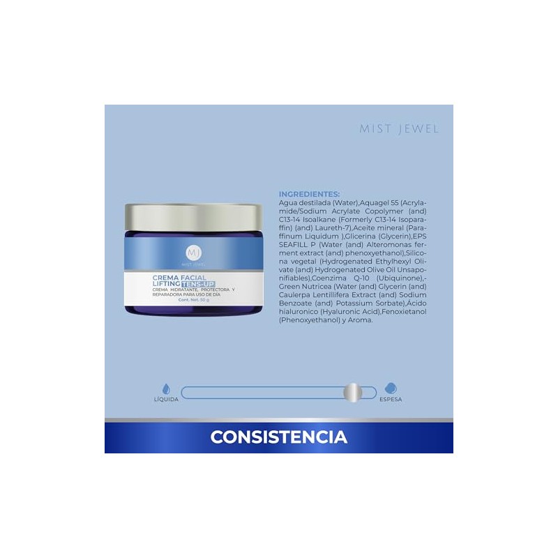 MIST JEWEL Crema TENS-UP Facial con Postbiticos marinos, cido Hialurnico, Caviar Verde y Q10 Crema tensora efecto lifting e hidratante de cuidado...
