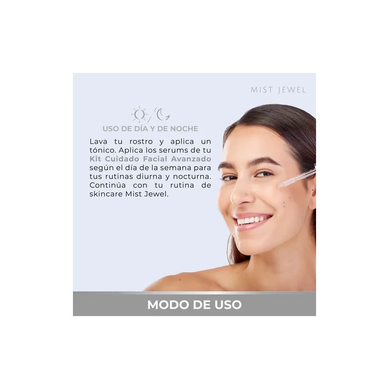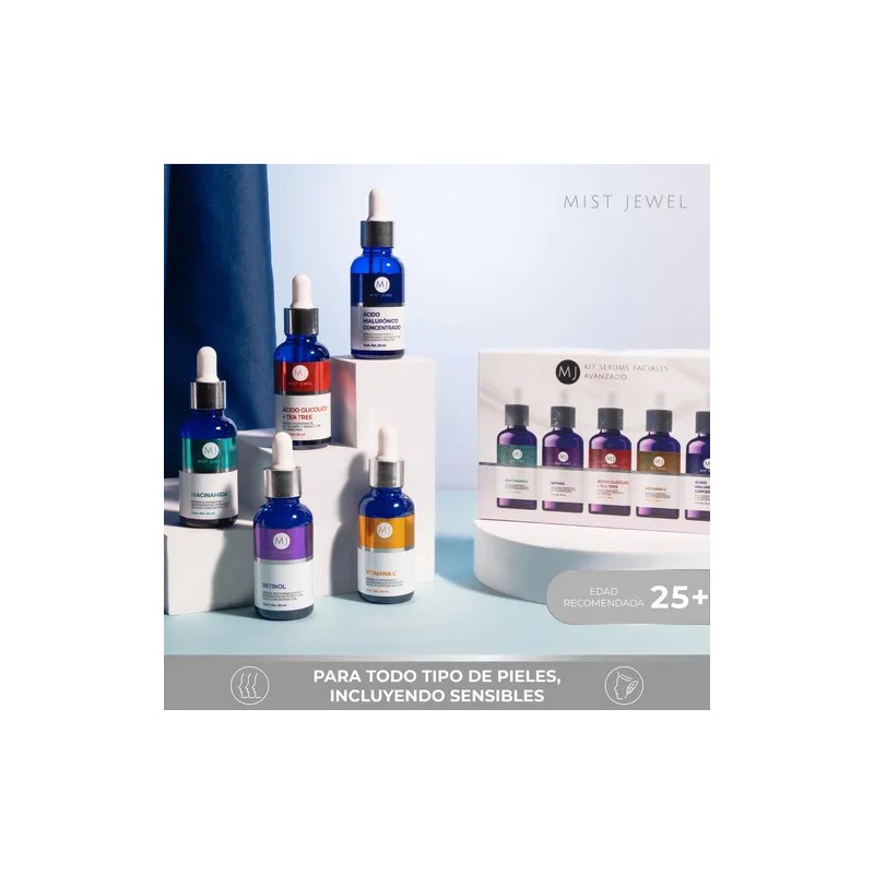 Mist Jewel Kit Facial Avanzado reúne cinco sueros esenciales para una rutina completa de cuidado facial que hidrata, renueva, ilumina y protege la piel. Cada fórmula está diseñada con ingredientes activos de alta eficacia como ácido hialurónico, retinol, vitamina C, niacinamida y ácido glicólico, ideales para combatir signos de envejecimiento, mejorar la textura y unificar el tono.