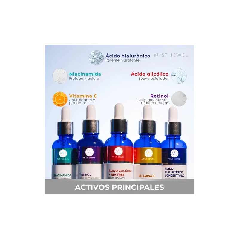 Mist Jewel – Kit Facial Avanzado con 5 Sueros: Ácido Hialurónico, Retinol, Vitamina C, Niacinamida y Ácido Glicólico para Rutina Día/Noche (5 x 30 ml)