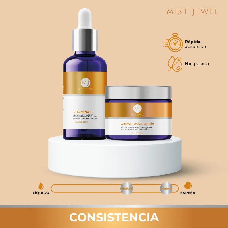 MIST JEWEL |Paquete Facial con serum Vitamina C + E + Ácido hialurónico y Crema de Día fotoprotectora FPS 30 Ácido Ferúlico y Vit C 50g | Skincare facial de máxima protección e hidratación para el día