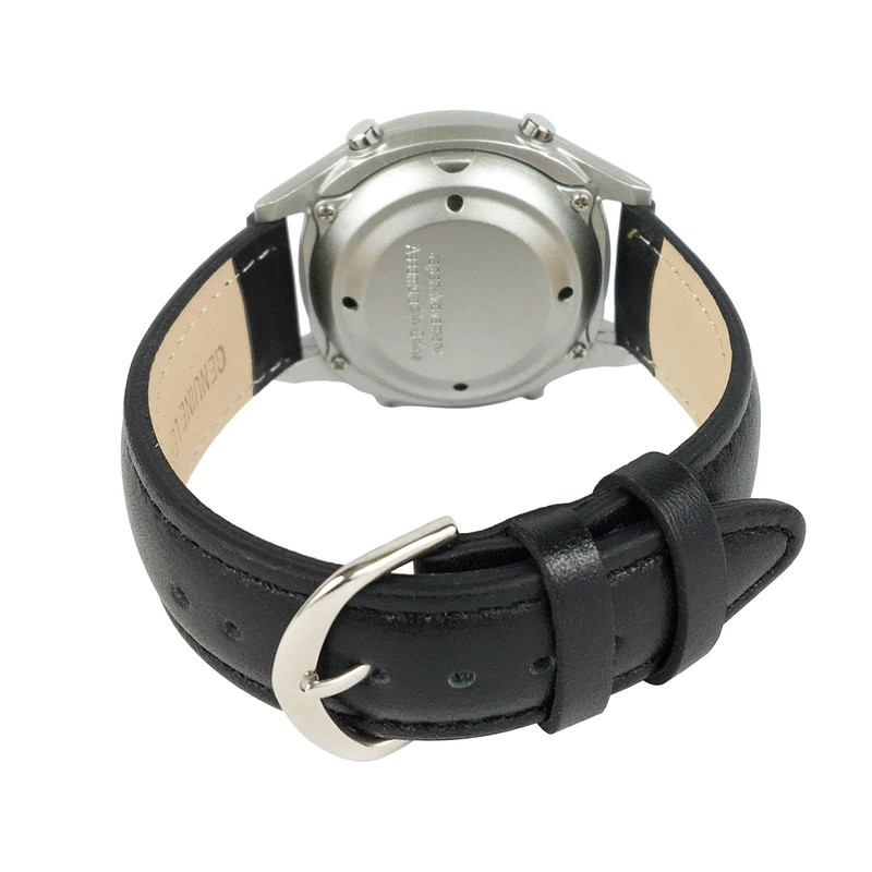 - This stainless steal watch with black leather band can be added to great gifts for a blind person and a talking clock for elderly loved ones as well! Also, it’s a great ladies talking watch and atomic watch for men. This is a nice talking clock for visually impaired, and it’s great with visual aids for macular degeneration of loved ones. You could buy two for a set of his and hers watches! A women talking watch and talking watches men will love!