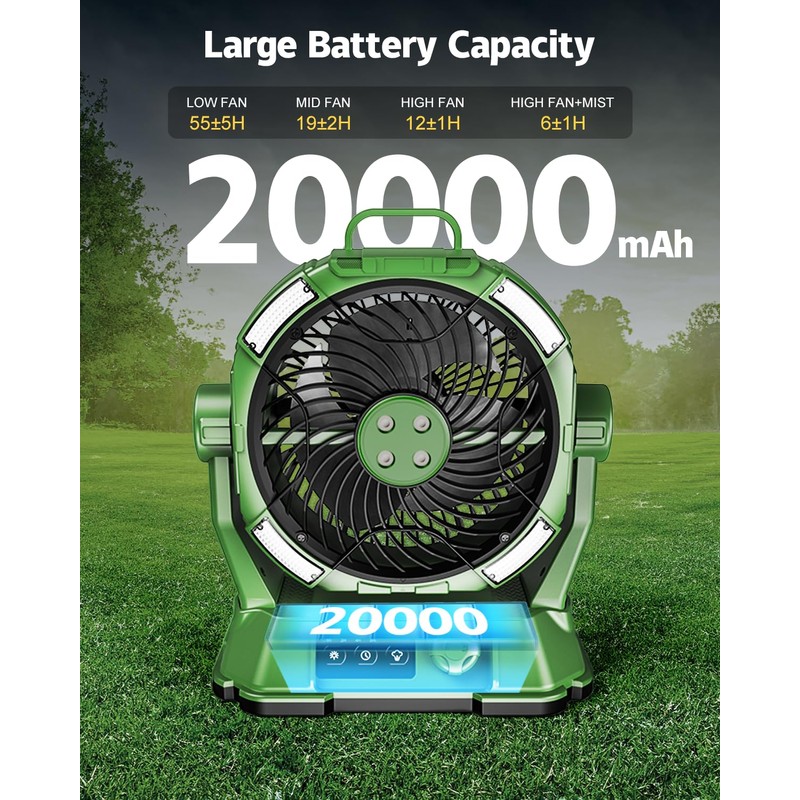 - 20000mAh RECHARGEABLE BATTERY & USB Charging - No power outlet in travel? No problem! The misting fan portable built-in 20000mAh rechargeable battery, it can provides: 6-7 hours on Fan + Mist mode, 12-55 hours on Fan-only mode. Besides, you can use the USB port to charge your phone while on the go! The 6L large water tank ensures 5-8 hours of continuous misting, making it ideal for all-day outdoor use.