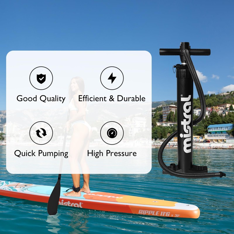 - Dual-Action Efficiency: Mistral hand pump features a dual-action pumping mechanism which inflates on both the push and pull strokes, significantly reducing the time and effort required to inflate your SUP or kayak