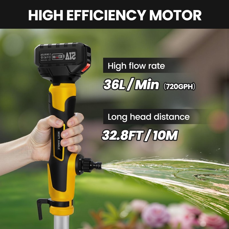 - CORDLESS STICK WATER PUMP: MistyJungle stick transfer pump is compatible with makita18V/21V batteries, equipped with waterproof switch and waterproof controller, which is very suitable for garden watering, outdoor small area drainage, home air swimming pool water supply, etc. When using, the pump and filter are kept as flat as possible and fully immersed in water, and the pump will achieve the best performance (battery not included)