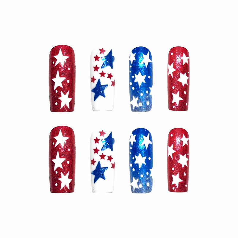 - 【Unique Design】 According to the most popular elements of the Independence Day moment, these short square press on nails are designed with red blue bling glitter and star.
