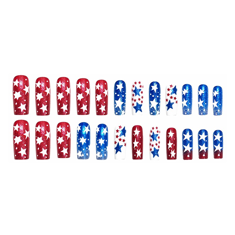 MISUD 4th of July Press on Nails Long Square Fake Nails Glossy Glue on Nails Red Blue Bling Glitter Acrylic Nail Supplies Squoval Artificial Nail Art Star False Nails with Design DIY 24 pcs