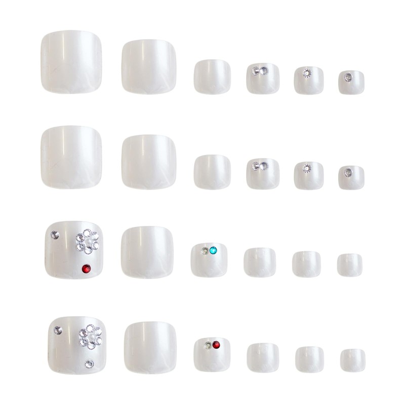 MISUD Chrome Press on Toenails Glossy Fake Toe Nails Glue on Toenails White Pearl Flash Acrylic Toe Fake Nails Rhinestone False Toenails with Design Full Cover Press-on ToeNails 24pcs