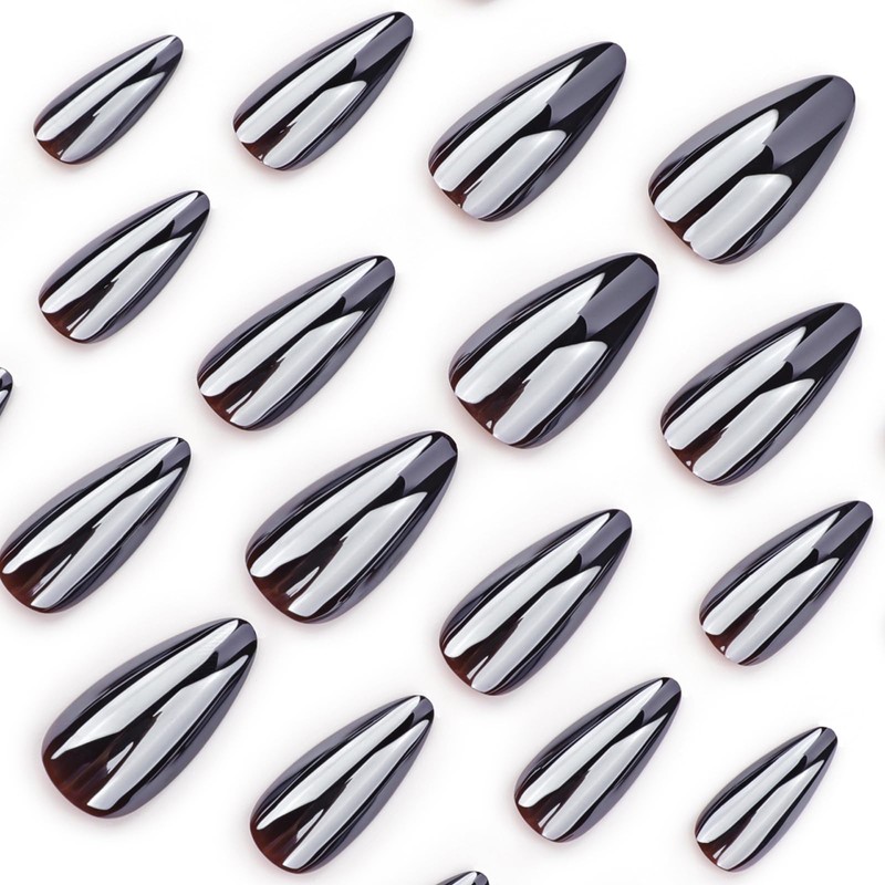 MISUD Press on Nails Almond Medium Fake Nails Glossy Glue on Nails Black Acrylic Nails Stiletto Artificial Nails Metal Chrome Stick on False Nails with Design 24 pcs