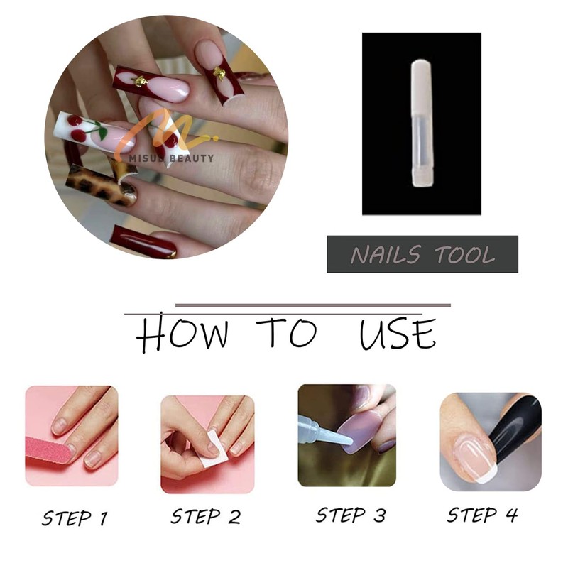 3.Select a right size of the nail, apply the glue to the back of the nail and put it on your fingernails.