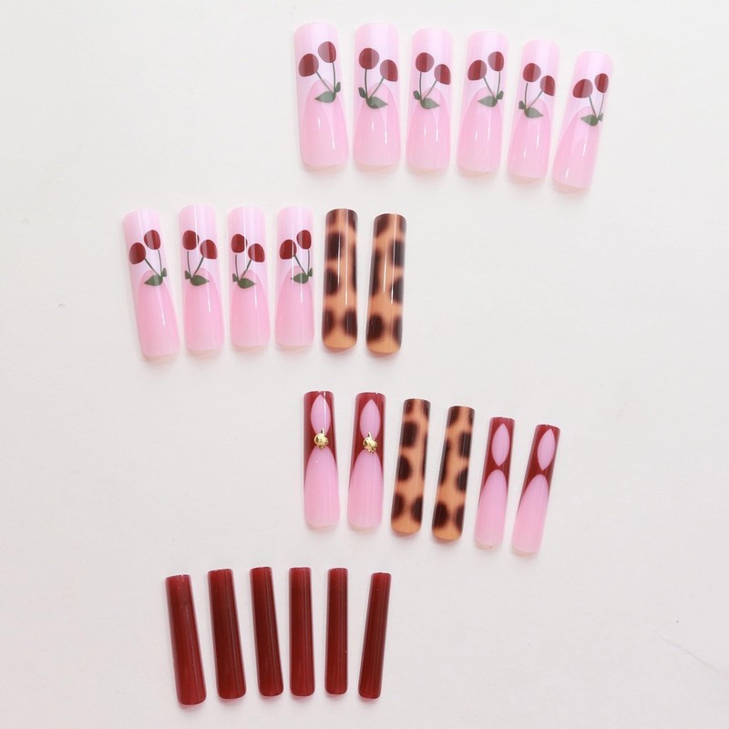 - 【Unique Design】 According to the most popular elements of the moment, these extra long square press on nails are designed with white french tip, tortoise and cute cherry.