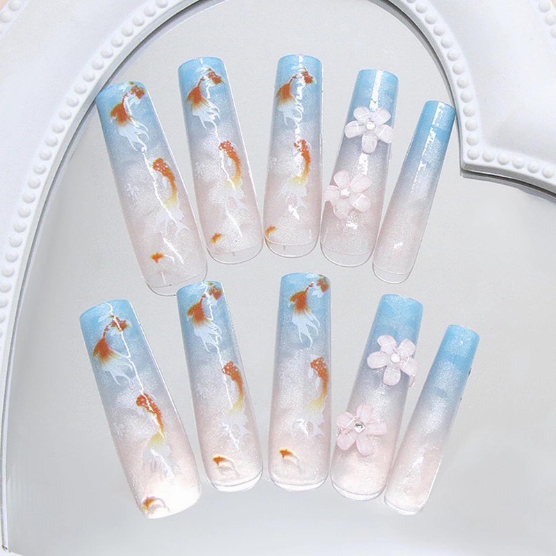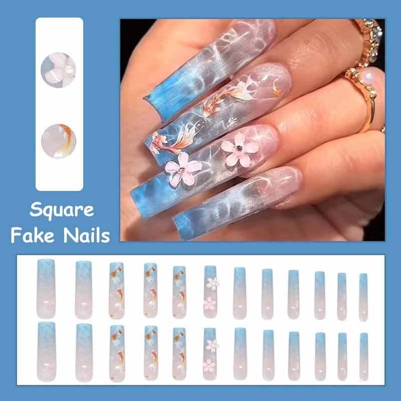 - 【Unique Design】 According to the most popular elements of the moment, these extra long square press on nails are designed with summer blue cat eye, fish and handmade 3d flower.