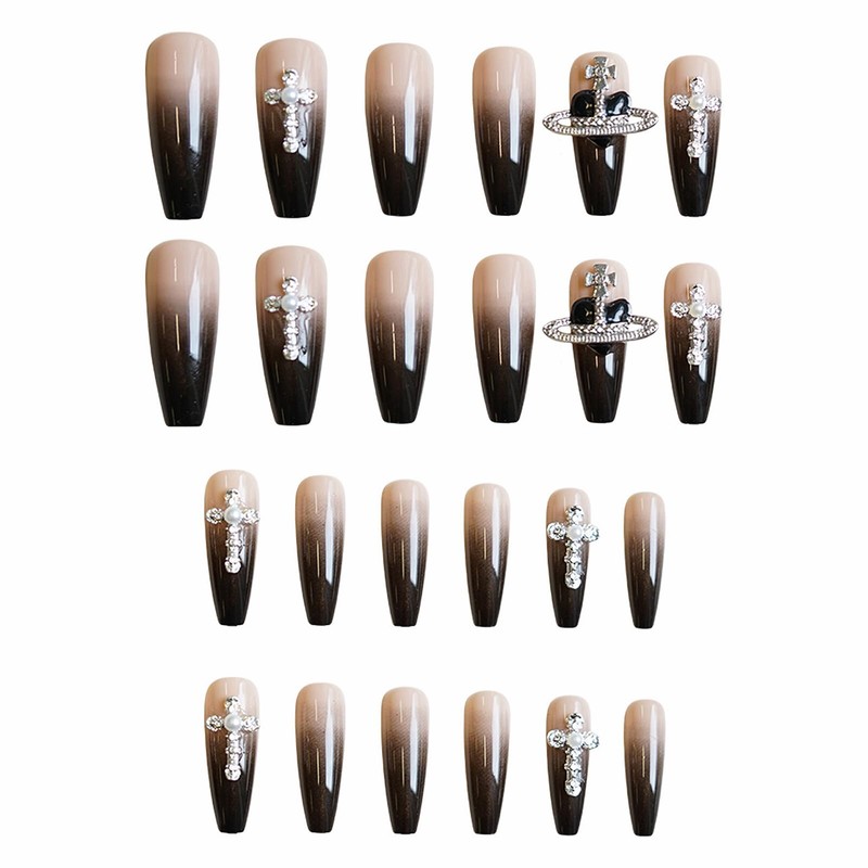 MISUD Press on Nails Long Coffin Fake Nails Glossy Glue on Nails Goth Black Ombre Acrylic Nails Ballerina Artificial Nails Cross Saturn Rhinestone Stick on False Nails with Design 24 pcs