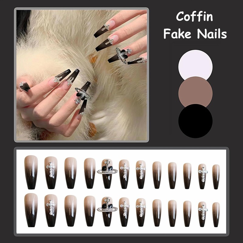 • 【Unique Design】 According to the most popular elements of the moment, these long coffin press on nails are designed with black ombre and luxury cross saturn diamond.