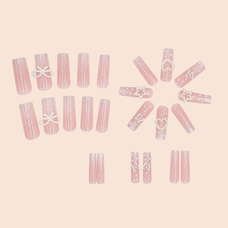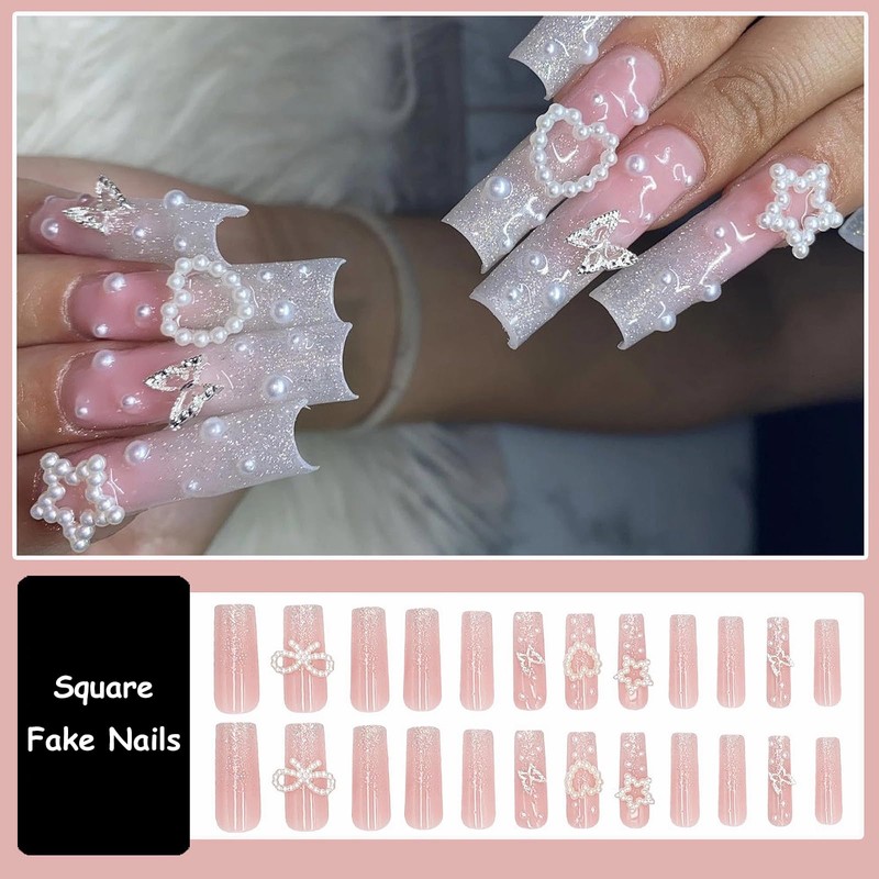 - 【Unique Design】 According to the most popular elements of the moment, these long square press on nails are designed with sparkly glitter sequins, pearl and luxury butterfly diamond.