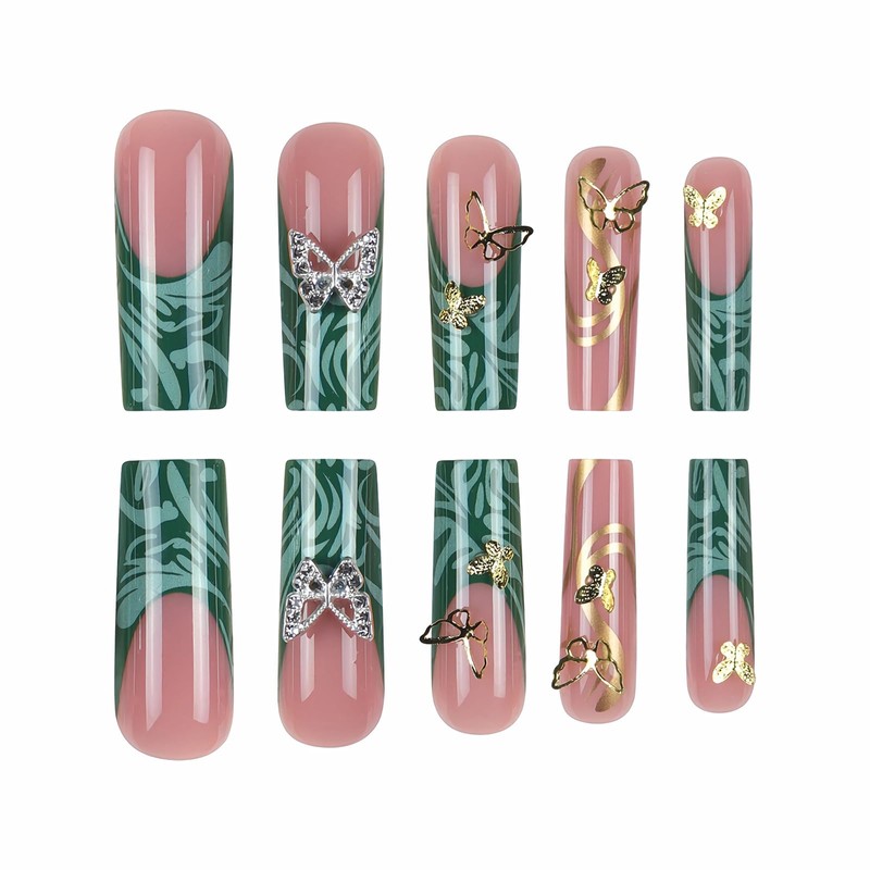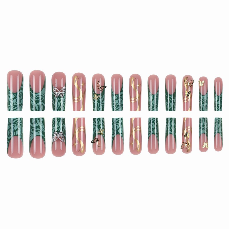 • 【Unique Design】 According to the most popular elements of the moment, these long square press on nails are designed with dark green french tip, gold chrome swirl and butterfly diamond.
