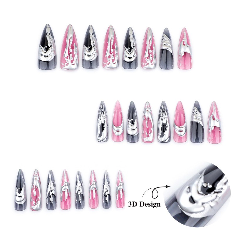MISUD Press on Nails Long Stiletto Fake Nails Glossy Glue on Nails 3D Silver Chrome Acrylic Nails Almond Artificial Nails Pink Black Ombre Stick on False Nails with Design 24pcs