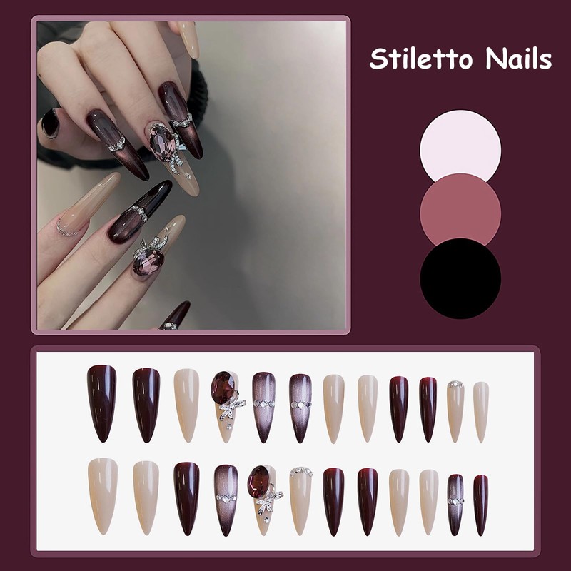 - 【Unique Design】 According to the most popular elements of the moment, these long stiletto press on nails are designed with nude gel, bling purple cat eye and luxury diamond.