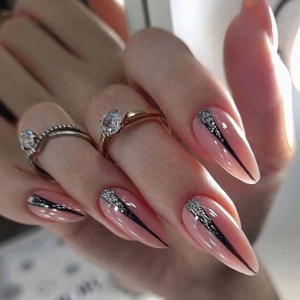- 【Unique Design】 According to the most popular elements of the moment, these medium almond press on nails are designed with black line and bling glitter.