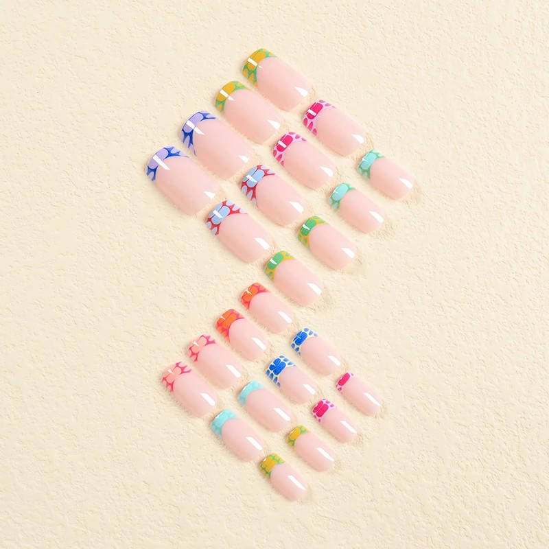 MISUD Press on Nails Short Square Fake Nails Colorful French Tip Acrylic Nails Glossy Glue on Nails Summer Squoval Artificial Nails Rainbow Edge Stick on False Nails with Design 24 pcs