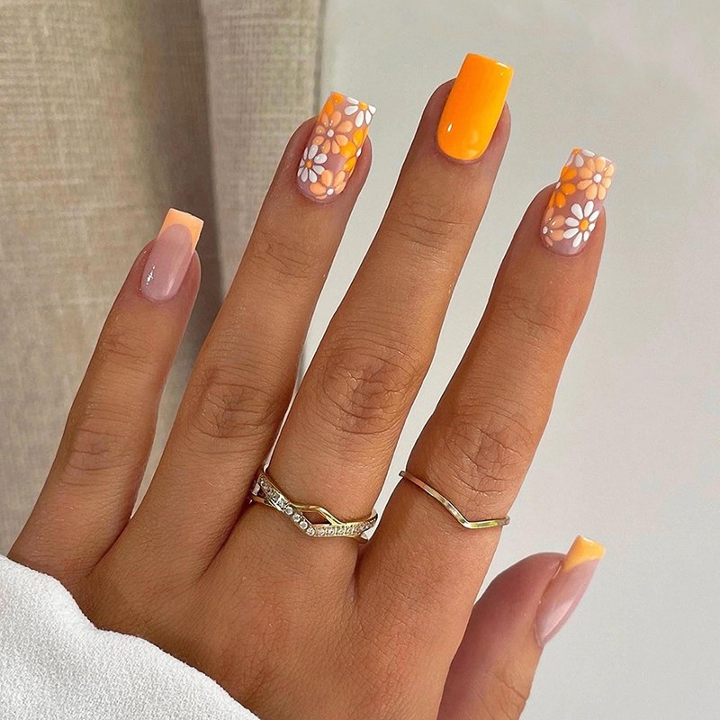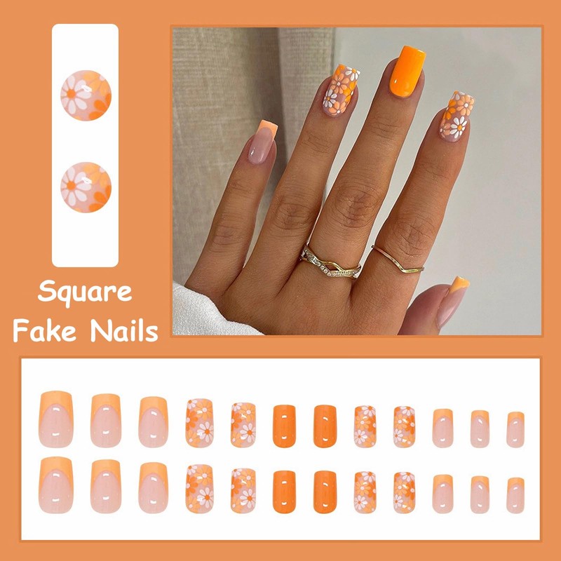 - 【Unique Design】 According to the most popular elements of the moment, these short square press on nails are designed with orange french tip and cute flower.