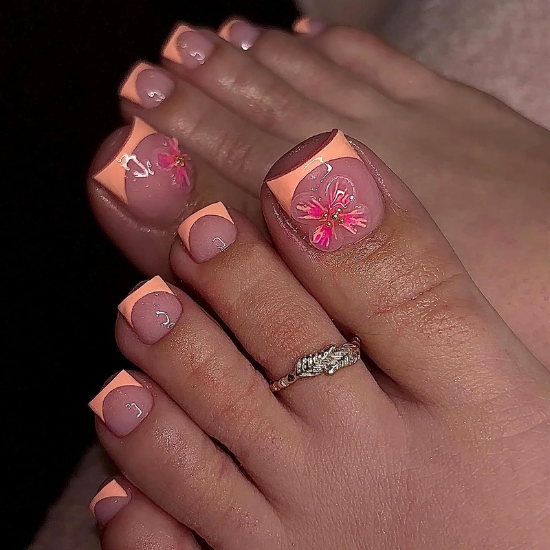 - 【Unique Design】 According to the most popular elements of the summer moment, these press on toenails are designed with orange french tip and pink flower.