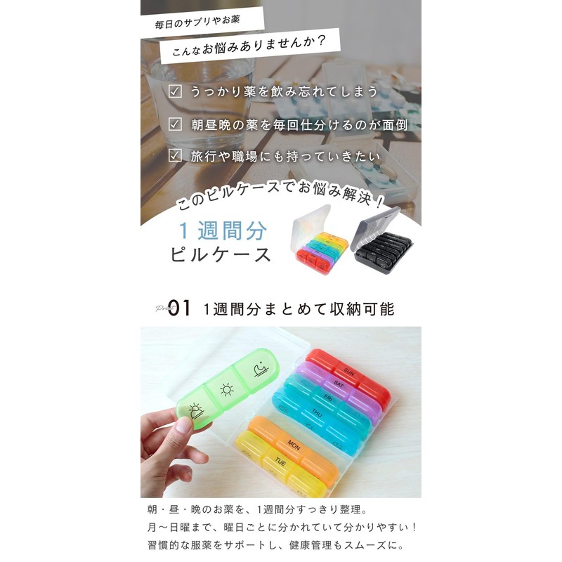 mitas 1週間分 ピルケース 大きめ かわいい 携帯用 サプリメント ケース 1週間 朝昼晩 飲み忘れ防止 コンパクト 持ち運び便利 おしゃれ シンプル