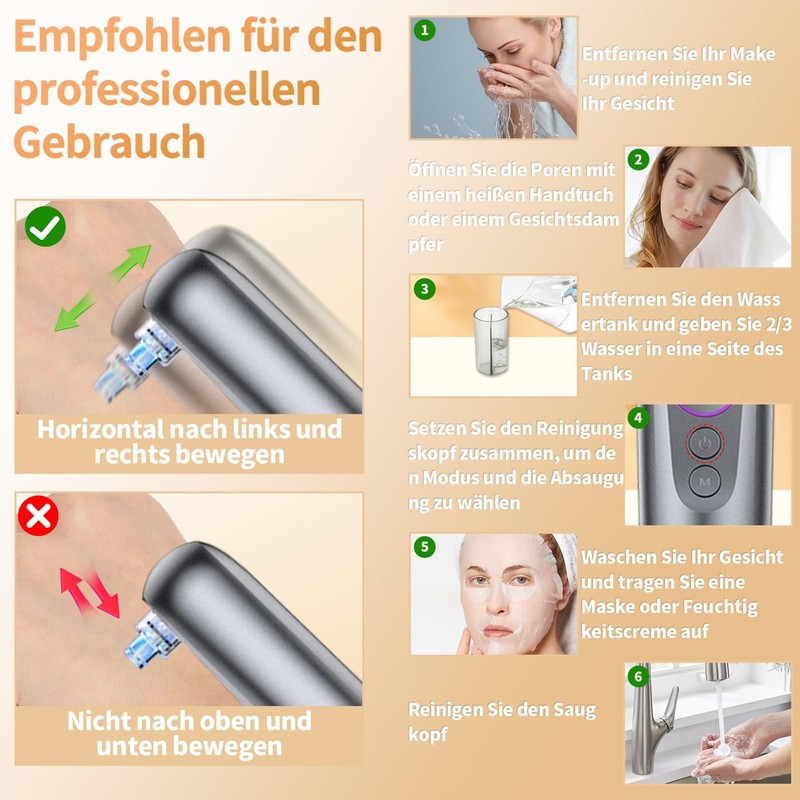 Warmer Tipp: Vor der Anwendung des Mitesser-Entferners empfiehlt es sich, die Poren mit einer heißen Kompresse oder einem Gesichtsdampfer zu öffnen und eine Peeling-Lösung aufzutragen. Wählen Sie die richtige Saugkraft und bleiben Sie nicht länger als 4 Sekunden in einer festen Position. Verwenden Sie nach der Anwendung von Mitesserentfernern kaltes Wasser oder eine Maske, um die Poren zu reinigen und Hautrötungen zu lindern.