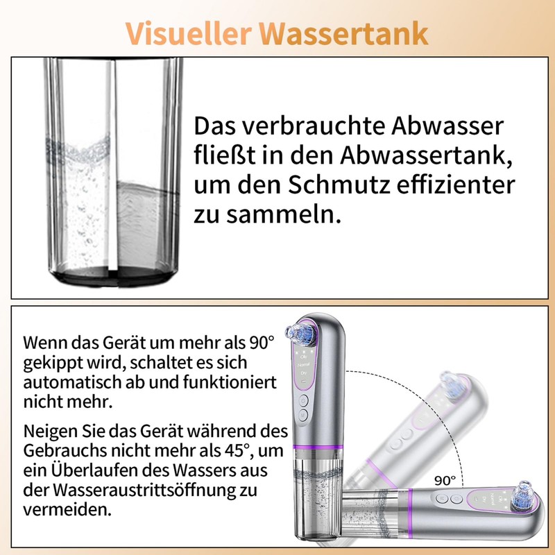 - 【Visueller Wassertank】 - Unser blackhead remover verfügt über ein Wasserzirkulationssystem, das Verunreinigungen automatisch abscheidet. Das porensauger mitesserentferner gerät befeuchtet die Poren während des Saugens mit einem sanften Wasserstrahl und befreit die Haut von Schmutz.Das visuelle Wassertankdesign macht es einfach, den Wasserstand zu beobachten und rechtzeitig Wasser hinzuzufügen oder zu entsorgen.Gereinigtes Schmutzwasser fließt in einen separaten Abwasserbehälter, wodurch sichergestellt wird, dass das Wasser nicht zirkuliert und Hautinfektionen verhindert werden.