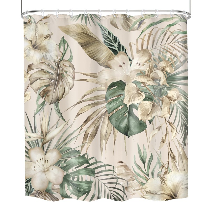 Mitpok Summer Tropical Leaves Shower Curtain 60Wx72H Green Palm Floral Hawaii Plant Monstera Banana Flower Beige Botanical Jungle Bathroom Decor Modern Bath Curtain Fabric Polyester 12 Pack Hooks