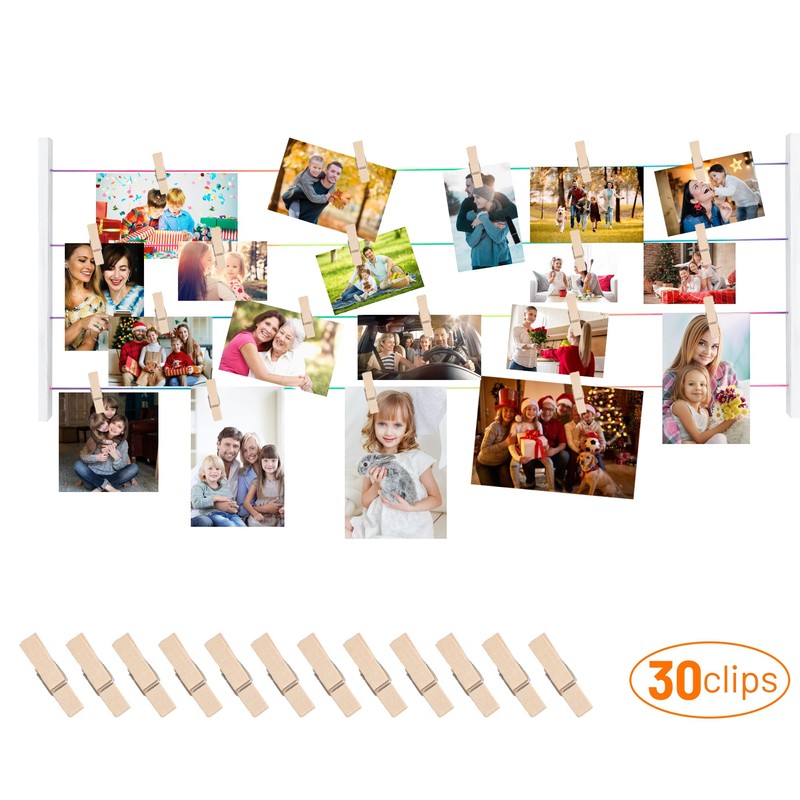 - Unique Designs with Premium Materials :The photo display board made with sturdy pine wood, ensuring a long-lasting and sturdy structure.Hanging photo display with 30 reusable clips to display multiple photos, postcards, or artworks.