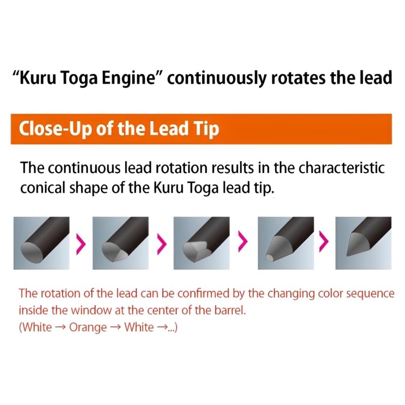 - KURUTOGA MODE: An innovative gear mechanism incrementally rotates the lead each time it's lifted from the paper, keeping it uniformly sharp for consistently crisp lines and clean notes. The rotation can be observed through the barrel window.