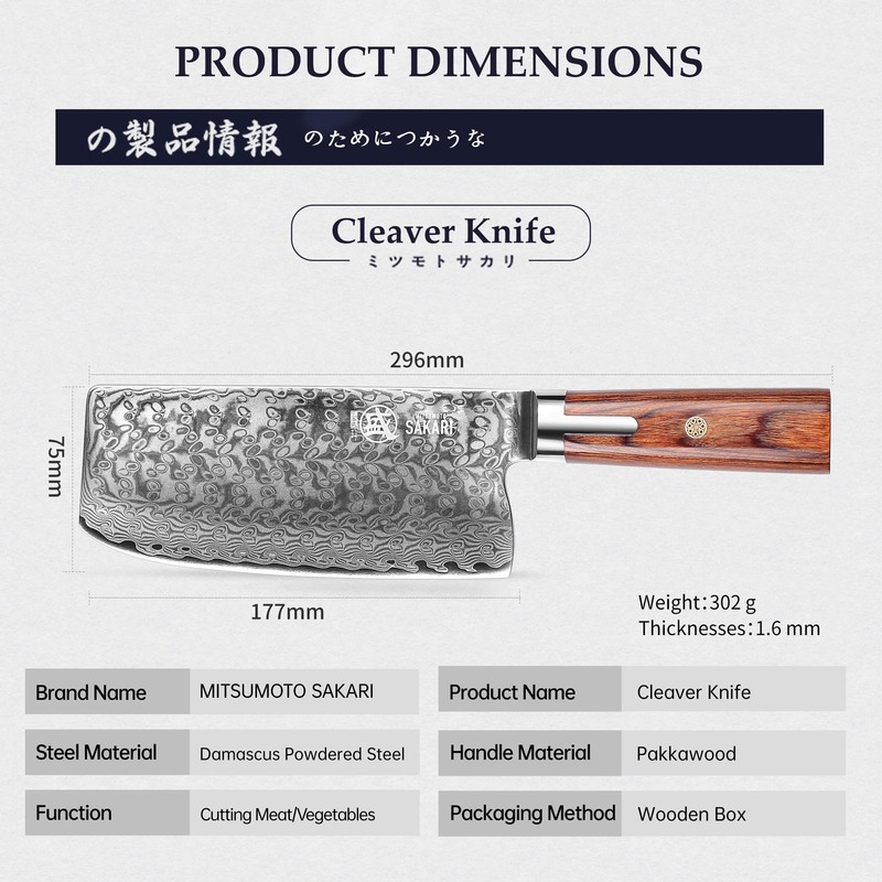 MITSUMOTO SAKARI 7 inch Japanese Cleaver Knife, Damascus S301 Powder Steel Meat Cleaver, Traditional Hand-Forged Chef Knife, Kitchen Knife for Cutting or Slicing