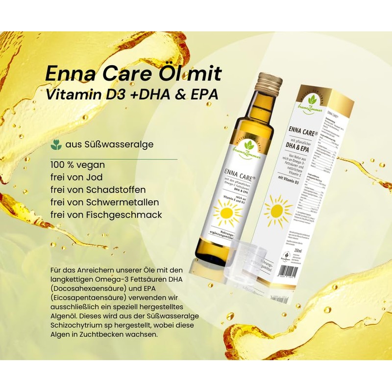 ProduktbeschreibungenDie ENNA Care ?lmischung ist ein registriertes Nahrungserg?nzungsmittel und wird aus kaltgepresstem Bio Lein?l, Weizenkeim?l, VITAMIN D3 und pflanzlicher DHA (Docosahexaens?ure) und EPA (Eicosapentaens?ure) hergestellt.Die ENNA Care ?lmischung hat von Natur aus einen hohen Gehalt an Vitamin E und Omega-3 Fetts?uren.Verzehrsempfehlung:Pro Tag 20 ml einnehmen. Die angegebene empfohlene t?gliche Verzehrsmenge darf nicht berschritten werden.Zutaten:Lein?l*, Weizenkeim?l, DHA & EPA (aus der Alge Schizochytrium sp.), Vitamin D3(*=aus kontrolliert biologischem Anbau)Hinweis:Nahrungserg?nzungsmittel sollten nicht als Ersatz fr eine ausgewogene und abwechslungsreiche Ern?hrung verwendet werden. Au?erhalb der Reichweite von kleinen Kindern lagern.Verpackungsgr??e:2 x 250 ml GlasflascheHaltbarkeit:Durch die in ENNA Care enthaltenen Omega-3 Fetts?uren h?lt das Produkt 3 Monate und sollte daher im Khlschrank gelagert werden.Vitamin D3 ?l / Omega 3 ?lTipp: Die ENNA Care ?lmischung l?sst sich problemlos einfrieren.Durchschnittlicher Energie- und N?hrstoffgehalt pro 20 mlBrennwert 740 kJ / 180 kcalFett: 18,4 gdavon ges?ttigte Fetts?uren: 1,6 geinfach unges?ttigte Fetts?uren: 2,9 gmehrfach unges?ttigte Fetts?uren: 13,9 gKohlenhydrate: 0 gdavon Zucker: 0 gEiwei?: 0 gSalz: 0 gVitamin D3: 800 iE20 ml ENNA Care ?lmischung enthalten 250 mg DHA und 125 mg EPA.Alle Angaben unterliegen den bei Naturprodukten blichen Schwankungen.Herkunft: Nicht-EUZertifizierung: QC&I GmbHAllergene: neinVerantwortlicher Lebensmittelunternehmer /Hersteller:Bruno Zimmer e. K.Gewerbegebiet Wallfeld 666649 Oberthal - Deutschlandservice@brunozimmer.deInhaltsstoffe / ZutatenLein?l*, Weizenkeim?l, DHA & EPA (aus der Alge schizochytrium sp.), Vitamin D3, (*=aus kontrolliert biologischem Anbau)WarnhinweiseNahrungserg?nzungsmittel sollten nicht als Ersatz fr eine ausgewogene, abwechslungsreiche Ern?hrung und gesunde Lebensweise verwendet werden. Au?erhalb der Reichweite von kleinen Kindern lagern.