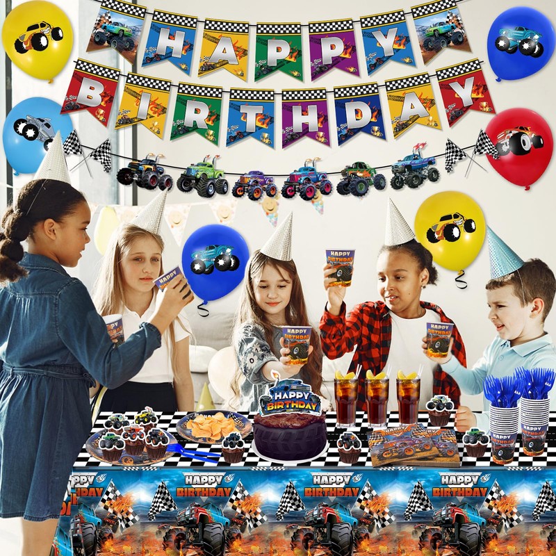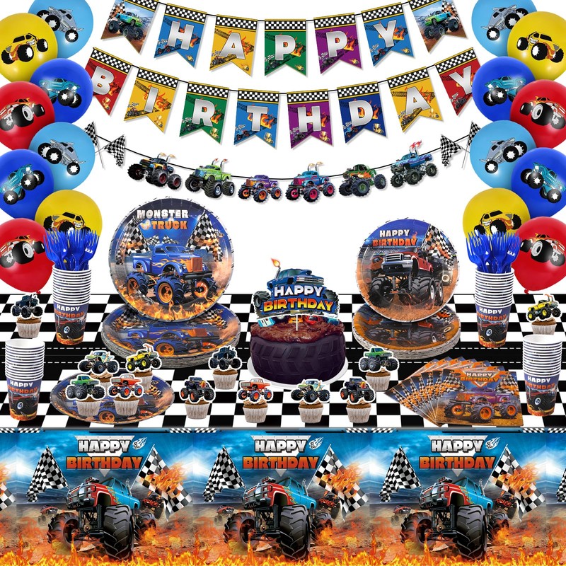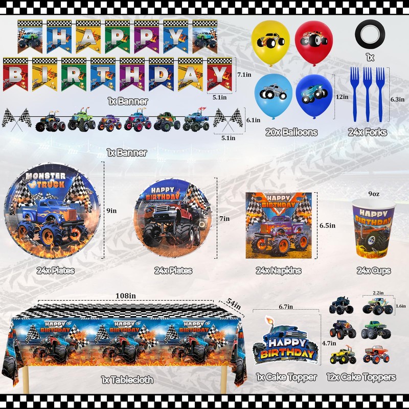 • Valuable Truck Tableware - This Monster Truck Party Tableware Set includes 1pc party tablecloths, 1pc happy birthday banner, 1pc truck banner, 1pc cake topper, 12pcs cupcake toppers, 12pcs latex balloons, 24pcs 9' plates, 24pcs 7' plates, 24pcs 9oz cups, 24pcs 6.5' napkins, 24pcs forks. Adequate quantities and complete sets will meet most of your party decorating needs.