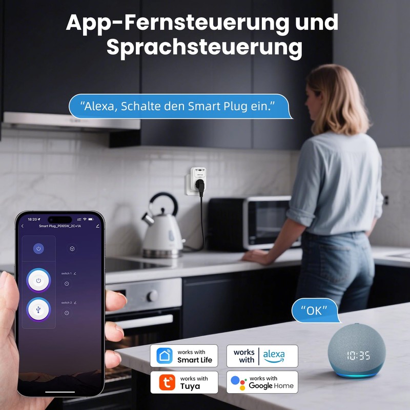 - Full voice control and smart home integration: easy integration into your smart home. Control the smart socket with USB conveniently with Alexa or Google Home. Create automated routines (e.g. "Alexa, turn off the socket") for a smart home.