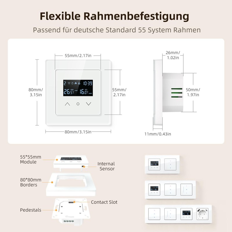 - Stable: the flush-mounted thermostat has a split panel design (80 x 80 mm outer frame, 55 x 55 mm inner frame) and can be used directly in a free-standing installation or in a 1-compartment frame or multi-compartment cover. frame of a conventional system 5 5. Easy integration into existing switch series from leading manufacturers: Berker, Gira, Merten, Jung and Elso.