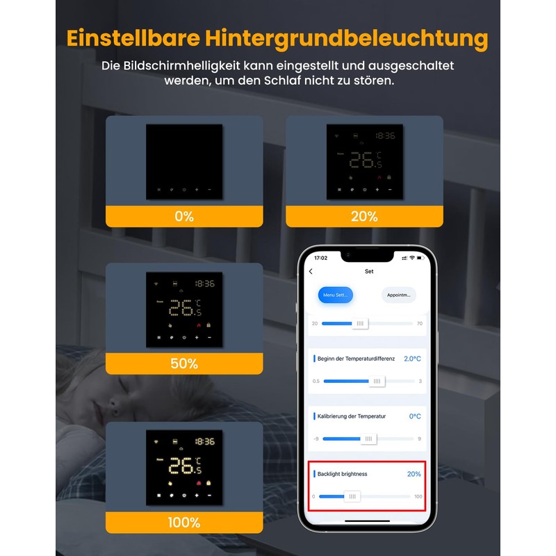 - Adjustable backlight brightness: The brightness of the thermostat screen for water underfloor heating or gas boiler can be adjusted percentage or completely switched off to avoid sleep disturbances.