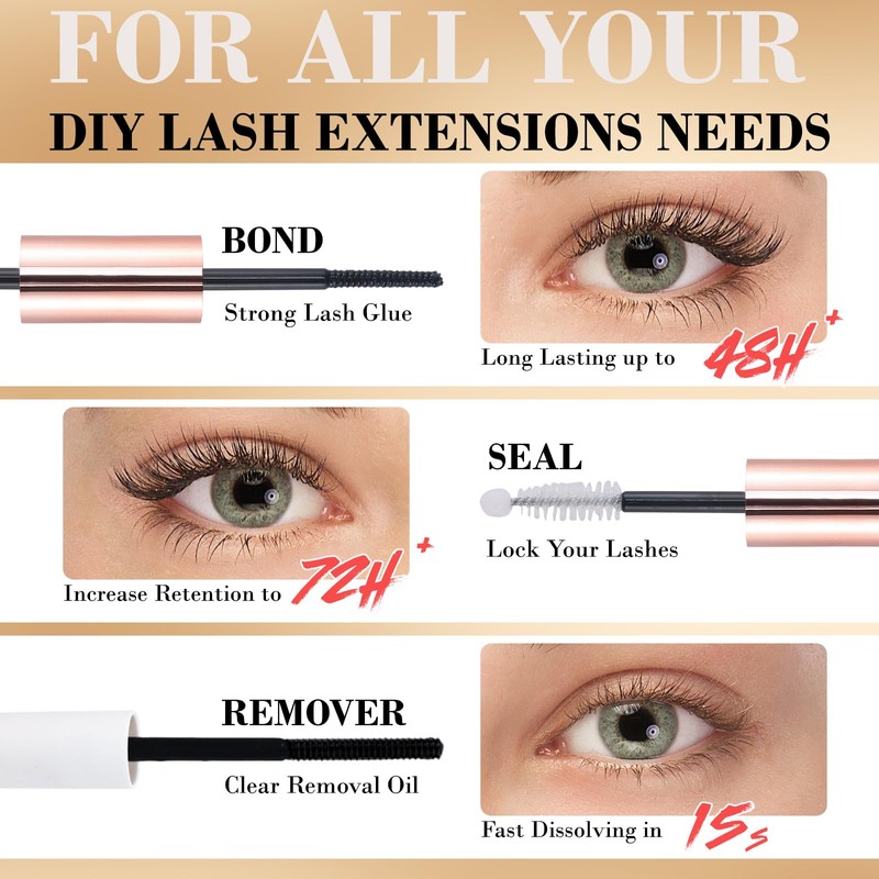 - Apply Lashes in 5 Minutes: Gently scrape off excess lash glue, brush your natural lashes with lash bond, then place cluster underneath your natural lashes for a comfortable and natural look, squeeze clusters against your lashes, wait 15s and apply lash seal to lock the bond