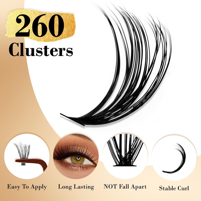 Including all you need for eyelash extensions - 260pcs thin band lash clusters, 1pcs cluster lash applicator tool,1 bottle of strong hold lash bond & sea and 1 bottle of cluster lash remover.