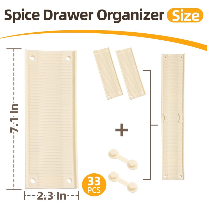 • 【33-Piece Set for Complete Spice Organization】With 33 pieces of drawer liners (7.1 x 2.3 inches each), you can fully customize your spice drawer. Mix and match pieces to perfectly fit your drawer size and achieve the best spice organization solution for your kitchen. Say goodbye to messy drawers and hello to an efficient, organized space