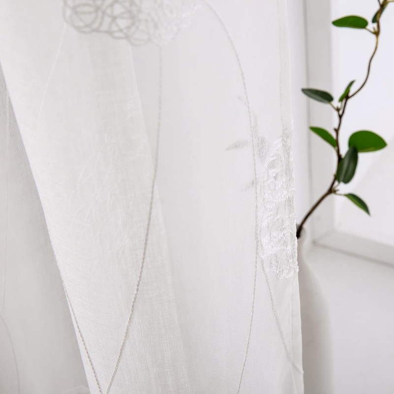 - The embroidered curtain can be hung in the living room, bedroom, study and dining room. They are a real eye-catcher. You can also hang them like scarves on hinged half curtain rods and clamp them to the side of the window. You can also hang these sheer curtains in combination with thick curtains to enhance the decorative effect of the curtains.