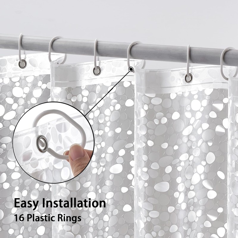 - Easy Installation The transparent shower curtain has 16 stainless steel grommets at the top and 16 plastic rings for easy installation. It is suitable for straight or curved shower rods. It will be the best choice for shower cubicles and tubs in homes, schools, gyms, dormitories, etc.