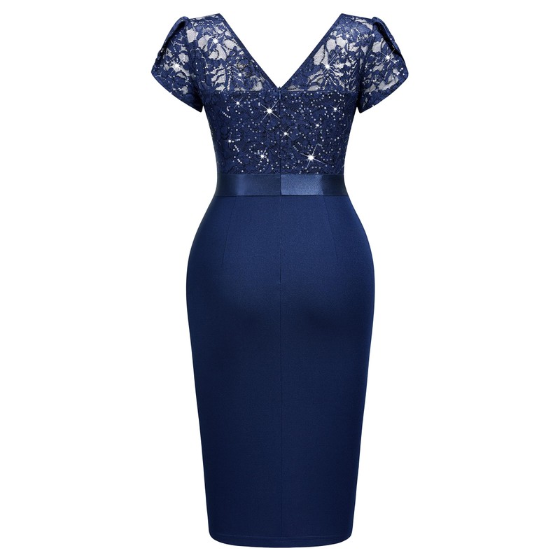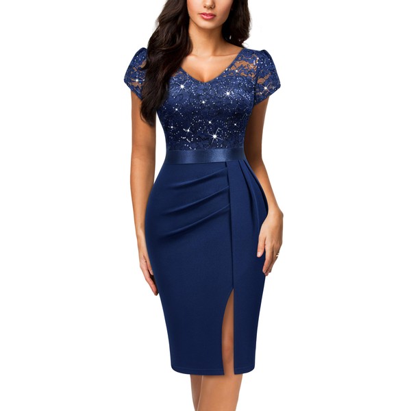Miusol Women's Classy V-Neck Glitter Sequin Lace Cap Sleeve Cocktail Party Dress (Large, Navy Blue)