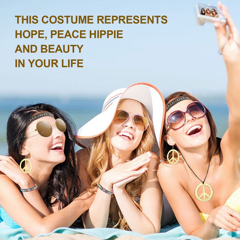- Inhalt: 5 Stück Hippie Accessoires, einschließlich Sonnenbrille, Peace Zeichen Halskette und Peace Zeichen Ohrring, Bohemia Stirnband und Boho Armband, zeigt einen Stil der 60er und 70er Jahre, passt den meisten Jugendlichen und Erwachsenen.